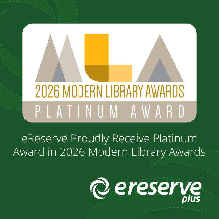 eReserve, a leading provider of reading list, copyright and analytical tools for universities and colleges, announced today that eReserve Plus, its premier reading list and course reserve platform, has earned the Platinum Award in LibraryWorks’ 11th annual Modern Library Awards (MLAs). Achieving a score of 9.4 out a possible 10, eReserve Plus was evaluated by librarians with direct product knowledge.